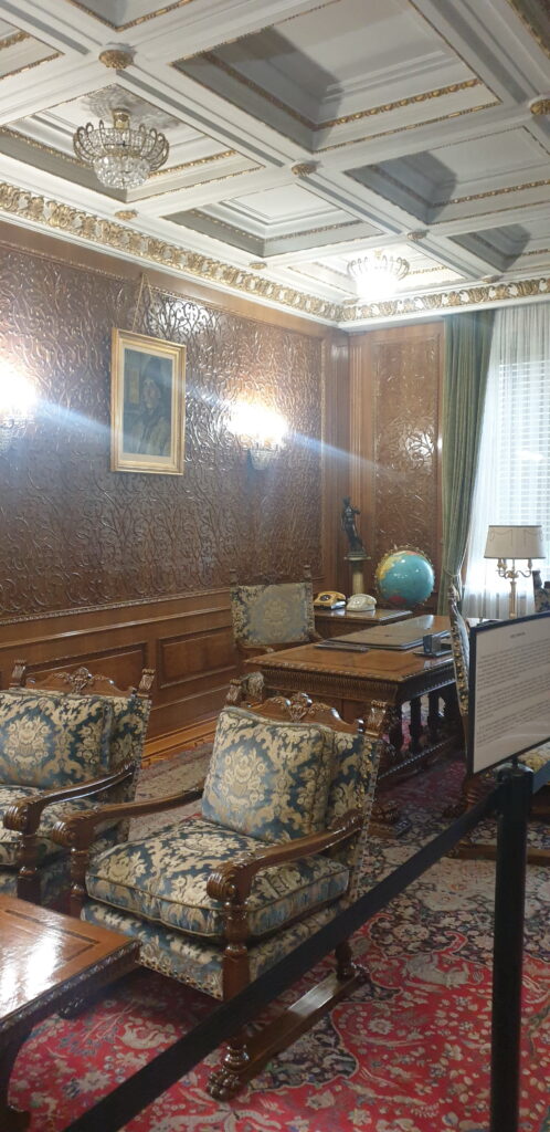 Your next stop the visit of Ceausescu House in Bucharest will be the living room. It is the largest room and the place where Nicolae Ceausescu met the US President, Richard Nixon. It was in 1969 after the Romanian president condemned the Russian invasion of Prague in 1968. The living room has also doors to a terrace where peacock used to live, being the dictator’s favorite birds.